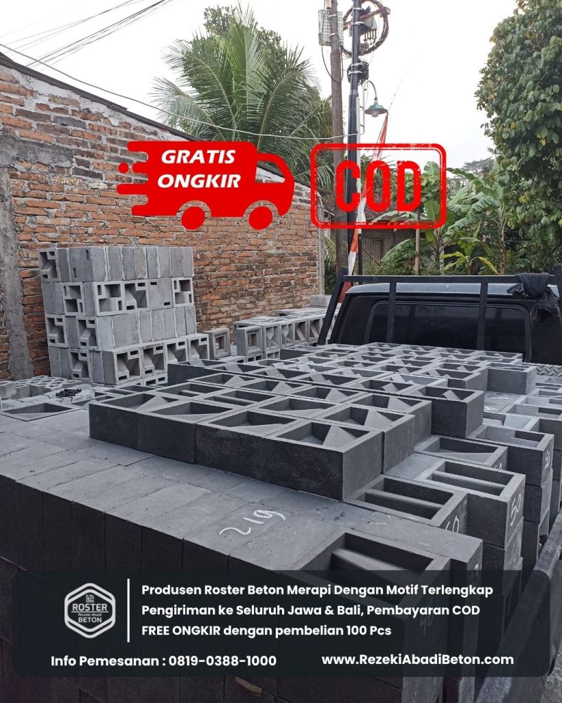 Anda bisa menikmati promo Gratis Ongkos Kirim ke seluruh Jawa dan Bali untuk pemesanan minimal 100 pcs roster beton. Untuk pemesanan di bawah 100 pcs, kami akan tetap memberikan diskon ongkir terbaik.